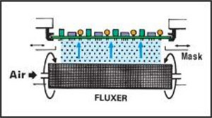 Our revolutionary Drum-Spray Fluxing Technology, included as standard equipment with C350 systems, combines the simplicity of a foam fluxer with the precision of a spray fluxing system. Its simple, innovative design is extremely easy to set up and maintain and is just one more example of a feature we've added to contribute to the C350's low cost of ownership. As shown in the diagram below, the Drum-Spray nozzle is positioned as close to the bottom of the PCB as possible and precisely applies flux in a thin vertical knife pattern across the full width of the board as it passes over the rotating drum. This method has been shown to provide more uniform application and less flux waste than systems that utilize small nozzles mounted to a reciprocating motor drive below the PCB. An adjustable mask is used to control the width of the spray pattern and optical sensors provide on/off control of the spray mechanism.