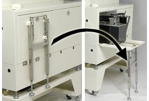 When the solder pot access panel on the rear of the unit is opened, the support legs (shown folded for storage at left) drop down and lock in place. The high-temperature, seamless solder pot and pump assembly can then slide out onto the access panel which now serves as a handy platform for easy loading and maintenance. |