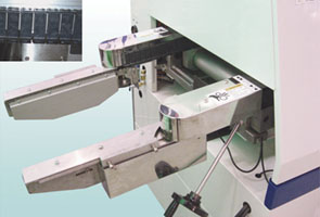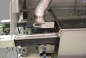 The chain-driven, pin-type inlet conveyor (included as standard) adjusts in unison with the finger
